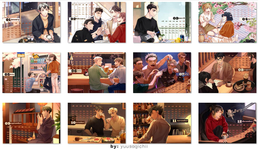 The 乾杯 「kanpai」 drinks collection is a Haikyuu project that consists of different characters indulging in various sorts of drinks throughout the year.Twelve (12) illustrations were created as a representations of each different month, each following a seasonal theme as the illustrations progress, to be assembled into a calendar.