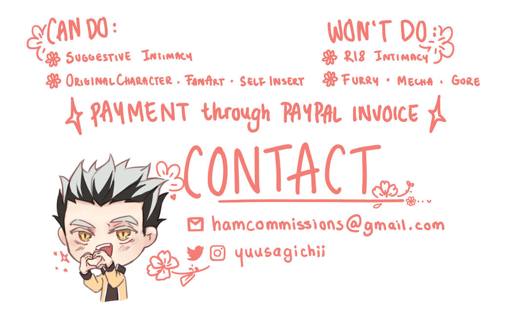 • The client is permitted to post the commissioned artwork to social media with the credit to yuusagichii. Credit by a direct link to, or mention of, yuusagichii's social media is preferred. (tumblr: yuusagi-chii; twitter: yuusagichii; instagram: yuusagichii)