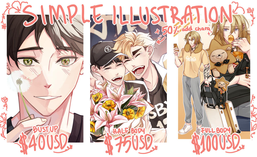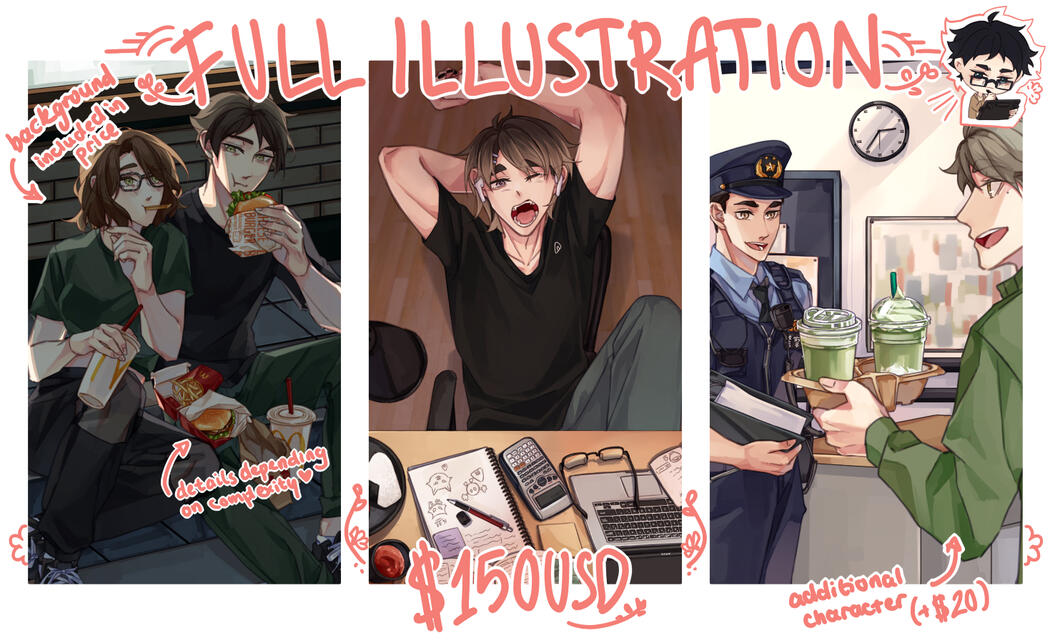 FULL ILLUSTRATIONS $150 USD AND ABOVE (+1 CHARACTER = +$20 USD)
